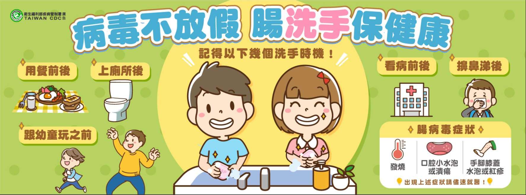 三、腸病毒在人與人密切接觸、互動頻繁的地方容易傳播,請定期清洗消毒幼兒常接觸的物品、玩具及絨毛玩偶,教導幼童養成良好的個人衛生習慣及正確勤洗手,並注意環境通風。